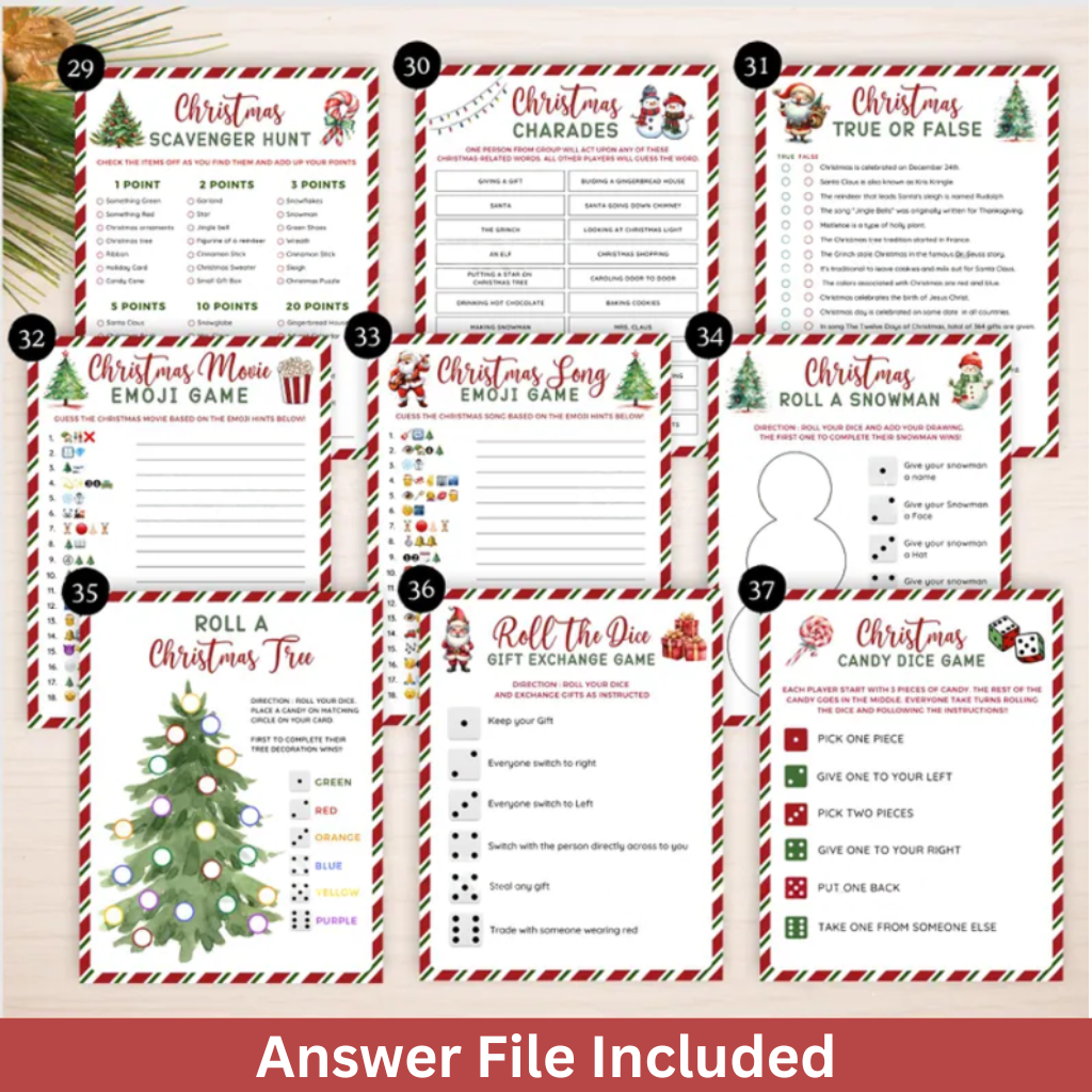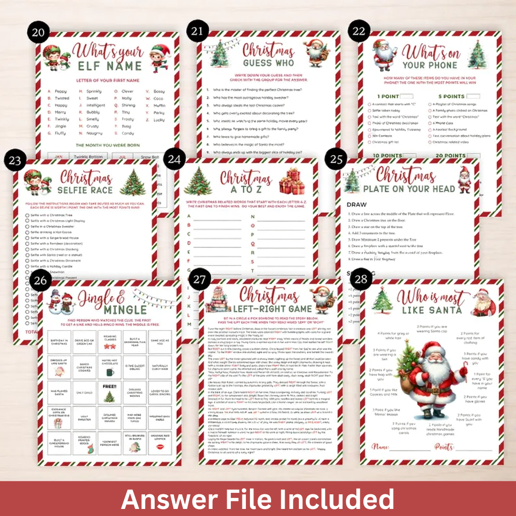 Whether you're hosting a cozy family night, a kids’ holiday event, or a lively Christmas party with friends, this printable bundle has a game for every age and every mood!